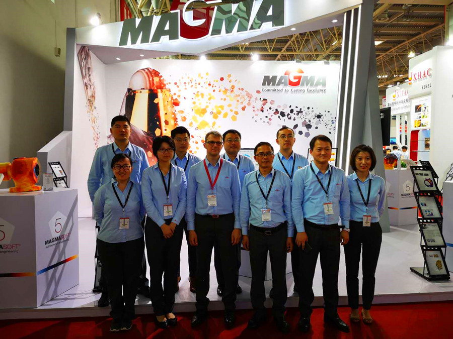 邁格碼參展團隊(前排左三為邁格碼中國區總經理馬修先生) 新版本MAGMASOFT新增了在高壓模塊里料筒的模擬,可全面了解金屬液從給料、穩料到壓射充型的整個過程中溫度、速度、卷氣和料筒變形等整個變化過程。同時對噴涂、冷卻及熱平衡做了進一步的優化,使各項參數更加貼近實際的鑄造過程。更重要的是在新一代的MAGMASOFT軟件里面,改進了網格的創建方法以及軟件的求解器,讓充型過程和實際流動更加的匹配。在應力方面,增加的對頂針引起的鑄件變形的模擬以更好的反應鑄件在鑄造過程中的變形。