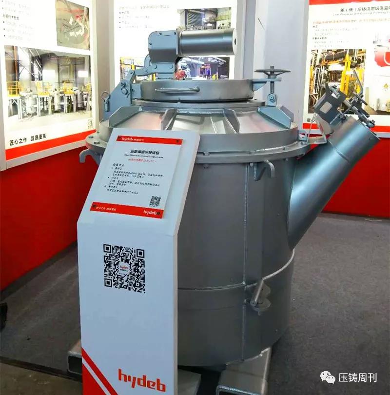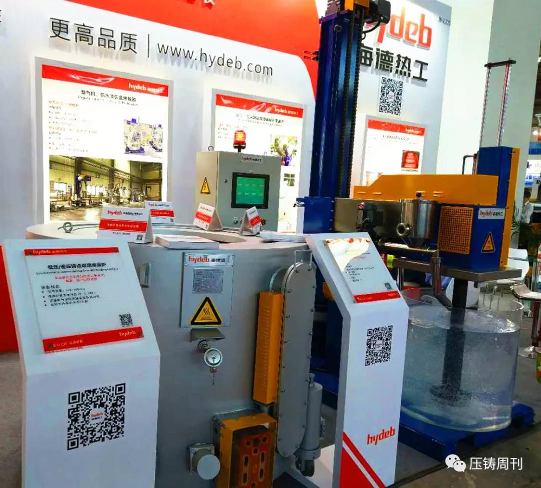 廣州德琺麒參展團隊(前排左二為廣州德琺麒總經理蒲昌月先生) 本屆鑄博會上,廣州德琺麒主要推介工業4.0智能壓鑄單元示范工程,即為一套自動化、智能化、數字化的壓鑄島,配置鋁水供應爐、恒溫淬火水箱、機器人仿型噴涂、機器人快速取件機、機器人取件視覺系統、料餅鋸切機、產品沖切整形機、通用去渣包機、機器人智能去毛刺,脫模劑自動配比回收機、模具油溫控制、模具點冷機、真空機,使用中央集成控制與反饋系統“串聯”成一個有機整體,并通過辦公室遠程監控、云端遠程控制,組成一套自動化、智能化、數字化的壓鑄生產線。 海德熱工:展示高效熱能技術及解決方案 濟南海德熱工有限公司專注于鋁合金鑄造的熱能設備研發和制造。本屆展會上,海德熱工攜鋁水精煉除氣機、遠程鋁水轉運包、低壓(差壓)鑄造坩堝保溫爐三款產品亮相展會,向國內外專業買家,展示其在鋁液轉運、熔煉保溫、精煉除氣的最新技術及應用解決方案。