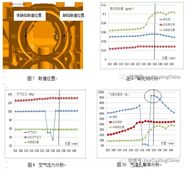 通過Anycasting鑄造模擬軟件計算,得出兩種方案氧化物含量云圖和空氣壓力云圖,如右圖所示,利用單一的判斷依據無法進行氣渣孔缺陷的判斷。需考慮氣體和氧化物共同作用下的分析計算。 1.3.2模擬結果取值分析 如圖7進行缺陷位置和非缺陷位置的氧化物含量取值,得出如圖8所示的氧化物含量曲線圖。如圖7進行缺陷位置和非缺陷位置的空氣壓力取值,得出如圖9所示的空氣壓力曲線圖。按照組合缺陷參數方法如下公式,進行計算: 氣渣孔概率=K[(氧化物含量)n x b(空氣壓力)m]x100% 通過數據放大擬合得出如圖9的氣渣孔概率曲線。明顯可以看出缺陷位置氣渣孔概率高達90%以上,與生產實際氣渣孔缺陷發生情況一致。非缺陷位置雖然氧化物含量高,但是氣渣孔概率低于40%,與實際生產一致。更改澆道方案雖然空氣壓力高,但是氣渣孔概率低于40%,與實際生產一致。