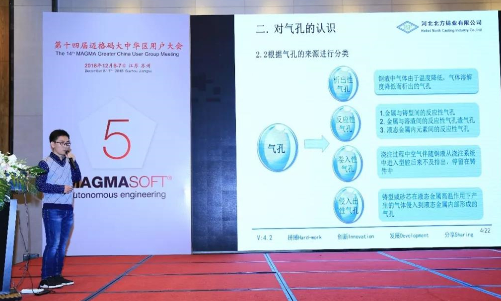 MAGMA新加坡總經理 趙望前博士 緊接著會議以使用單位(用戶)分享MAGMASOFT®的應用經驗及成果為主。來自河北北方鑄業(yè)的宋美新先生,分享了“利用MAGMASOFT 預測鑄件的氣孔缺陷”的報告,論述了對氣孔的認識以及如何利用MAGMA進行分析,將實際與模擬結合起來的案例。