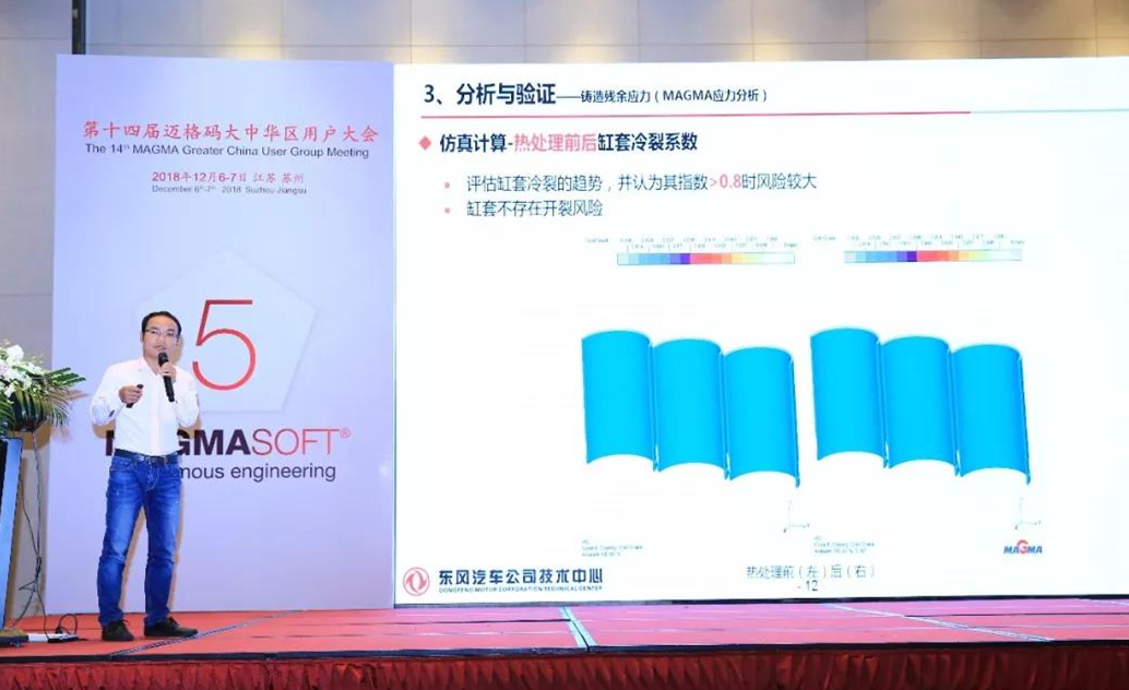 河北北方鑄業(yè) 宋美新 東風汽車公司技術中心的黃未華先生分享了“缸體壓鑄過程中缸套應力分析與驗證”報告,從鑄造殘余應力等多方面進行探討,闡述了如何利用MAGMA模擬分析解決了缸套開裂問題。