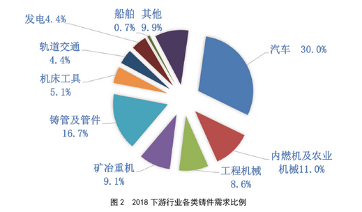 鑄件市場需求占比情況見圖2。由圖2可見,工程機械、鑄管及管件、軌道交通行業鑄件市場占比上升;汽車工業是鑄件最大需求用戶,2018年汽車鑄件占比下降至30.0%(2017年占比達30.6));農機、機床工具等行業市場占比都有下滑。