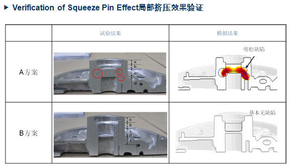 全新功能:局部擠壓縮松 隨著壓鑄件集成化程度越來越高,壓鑄產品也越來越復雜,壓鑄工藝不再局限于生產壁厚均勻的產品。圖示鑄件厚大位置區域,沖頭壓力不能有效傳遞到該位置,所以需要增設局部擠壓銷來解決該位置可能存在的縮松問題。其中黃色區域為該擠壓銷的影響區域。AnyCastingV6.6版本中的局部擠壓功能能夠綜合考慮擠壓銷壓力,擠壓銷運動速度,擠壓延遲時間、擠壓銷作用時間等因素來綜合判定局部擠壓對鑄件厚大位置縮松缺陷的影響。