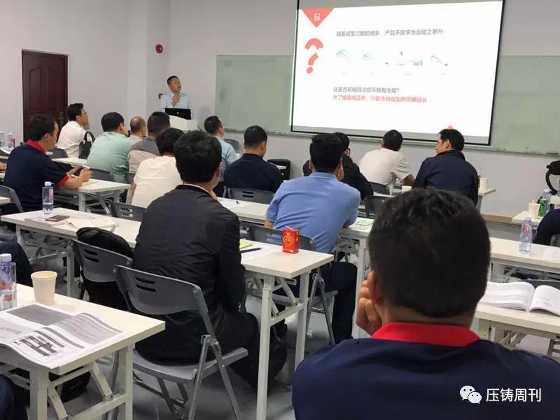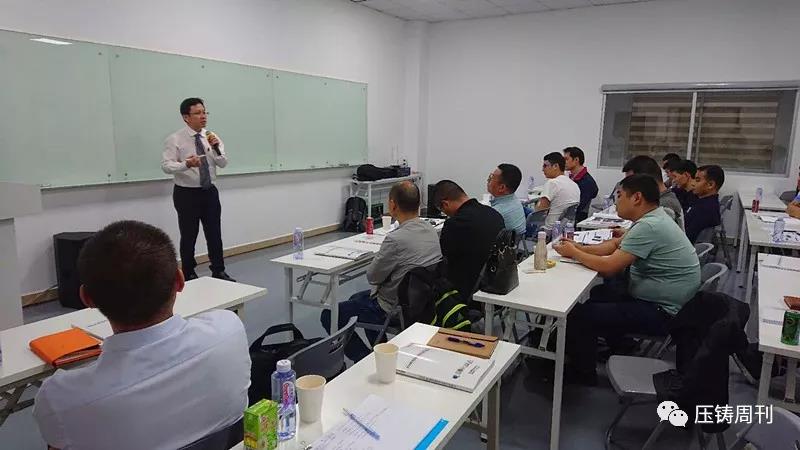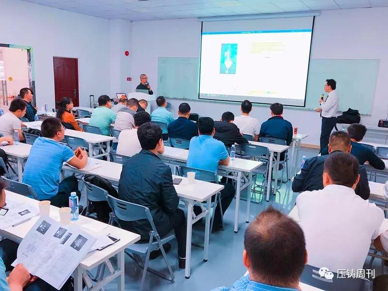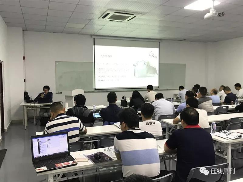 新臺通商總經理邱坤彰先生發言 隨后,研習會正式開始,第一天的報告主題包括:壓鑄產業概述,鋅壓鑄件流紋分析和切線型流道設計,超高速/超低速/高精度鋁壓鑄技術與特殊功能運用,工業4.0壓鑄數據管理系統中舊機與新機集中數據管理案例,高品質省能源鋁湯溶解技術,高品質熔湯處理技術,鋁壓鑄模具設計與不良對策,高品質壓鑄進階技術與設備:點冷系統/局部擠壓鑄造/PF吹氧真空鑄造等。