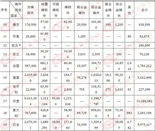注:A)2016年數據 B)2017年數據 C)包含球墨鑄鐵 D)2015年數據 E)包含所有有色合金 F)包含鋅合金 G)包含所有鐵合金 表2:2018年各國/地區鑄造企業數