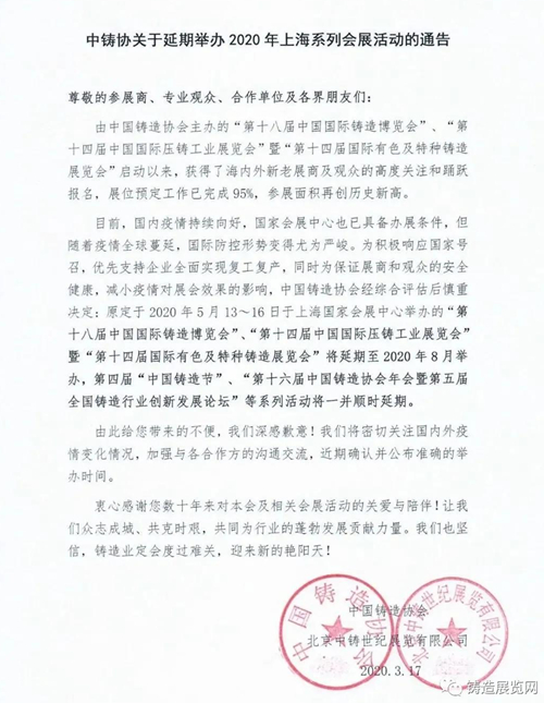 由中國(guó)鑄造協(xié)會(huì)主辦的“第十八屆中國(guó)國(guó)際鑄造博覽會(huì)”、“第十四屆中國(guó)國(guó)際壓鑄工業(yè)展覽會(huì)”暨“第十四屆國(guó)際有色及特種鑄造展覽會(huì)”啟動(dòng)以來(lái),獲得了海內(nèi)外新老展商及觀眾的高度關(guān)注和踴躍報(bào)名,展位預(yù)定工作已完成95%,參展面積再創(chuàng)歷史新高。 目前,國(guó)內(nèi)疫情持續(xù)向好,國(guó)家會(huì)展中心也已具備辦展條件,但隨著疫情全球蔓延,國(guó)際防控形勢(shì)變得尤為嚴(yán)峻。為積極響應(yīng)國(guó)家號(hào)召,優(yōu)先支持企業(yè)全面實(shí)現(xiàn)復(fù)工復(fù)產(chǎn),同時(shí)為保證展商和觀眾的安全健康,減小疫情對(duì)展會(huì)效果的影響,中國(guó)鑄造協(xié)會(huì)經(jīng)綜合評(píng)估后慎重決定:原定于2020年5月13~16日于上海國(guó)家會(huì)展中心舉辦的“第十八屆中國(guó)國(guó)際鑄造博覽會(huì)”、“第十四屆中國(guó)國(guó)際壓鑄工業(yè)展覽會(huì)”暨“第十四屆國(guó)際有色及特種鑄造展覽會(huì)”將延期至2020年8月舉辦,第四屆“中國(guó)鑄造節(jié)”、“第十六屆中國(guó)鑄造協(xié)會(huì)年會(huì)暨第五屆全國(guó)鑄造行業(yè)創(chuàng)新發(fā)展論壇”等系列活動(dòng)將一并順時(shí)延期。 由此給您帶來(lái)的不便,我們深感歉意!我們將密切關(guān)注國(guó)內(nèi)外疫情變化情況,加強(qiáng)與各合作方的溝通交流,近期確認(rèn)并公布準(zhǔn)確的舉辦時(shí)間。 衷心感謝您數(shù)十年來(lái)對(duì)本會(huì)及相關(guān)會(huì)展活動(dòng)的關(guān)愛(ài)與陪伴!讓我們眾志成城、共克時(shí)艱,共同為行業(yè)的蓬勃發(fā)展貢獻(xiàn)力量。我們也堅(jiān)信,鑄造業(yè)定會(huì)度過(guò)難關(guān),迎來(lái)新的艷陽(yáng)天! 來(lái)源:中國(guó)鑄造協(xié)會(huì) |
