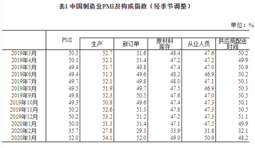 ![]() 據(jù)國家統(tǒng)計(jì)局網(wǎng)站消息,2020年3月份,中國制造業(yè)采購經(jīng)理指數(shù)(PMI)為52%,比上月回升16.3個百分點(diǎn)。3月份,我國疫情防控形勢持續(xù)向好,生產(chǎn)生活秩序穩(wěn)步恢復(fù),企業(yè)復(fù)工復(fù)產(chǎn)明顯加快。 截至3月25日,全國采購經(jīng)理調(diào)查企業(yè)中,大中型企業(yè)復(fù)工率為96.6%,較2月調(diào)查結(jié)果上升17.7個百分點(diǎn)。3月,21個制造業(yè)行業(yè)PMI均有不同程度回升,總體呈現(xiàn)出市場供需有所改善、政策效應(yīng)逐步顯現(xiàn)、新動能恢復(fù)較快等特點(diǎn)。