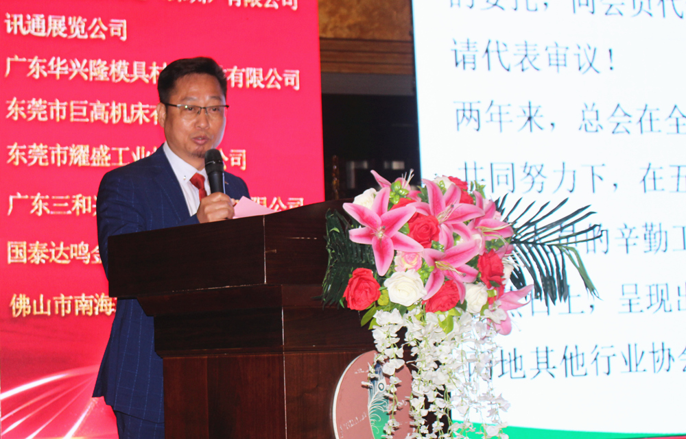 蔡子芳先生為贊助商代表頒發禮品 本屆會員大會得以成功召開,離不開各家贊助商的鼎力支持。感謝贊助本次大會的九家企業:順景園精密鑄造(深圳)有限公司、廣東華興隆模具材料科技有限公司、東莞市巨高機床有限公司、東莞市耀盛工業爐有限公司、廣東三和興模具材料科技有限公司、國泰達鳴金屬制品廠有限公司、佛山市南海雄新壓鑄有限公司。總會會長蔡子芳先生上臺為各家贊助商代表頒發紀念禮品。