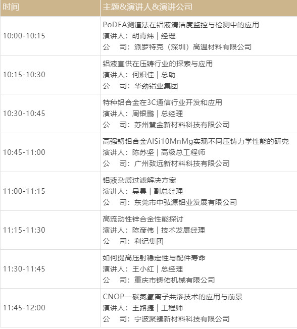 先進壓鑄設備技術研討會 12月11日上午10:00-11:30 下午13:00-14:45 本研討會主題涉及壓鑄機、定量熔爐、自動化、環保等。其最新的研究應用均在此研討會范圍,如超大型壓鑄機、高性能壓鑄機、多滑塊壓鑄機、伺服電機、超高真空技術、環保等。