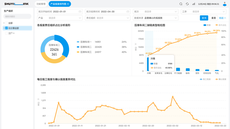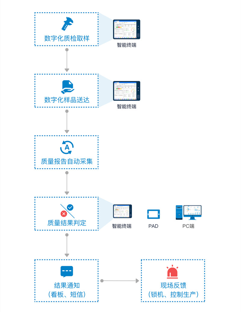 質(zhì)量管理流程示意圖 全流程質(zhì)量閉環(huán)管理 采用新一代物聯(lián)技術(shù)實(shí)現(xiàn)全流程質(zhì)量閉環(huán)管理,打通數(shù)據(jù)完整循環(huán)。將檢測(cè)設(shè)備全面聯(lián)網(wǎng),直接獲取設(shè)備的過程檢測(cè)數(shù)據(jù),并通過掃碼、刷卡的方式,將人為送檢流程納入數(shù)字化系統(tǒng)管控范圍,實(shí)現(xiàn)檢驗(yàn)結(jié)果的自動(dòng)判定生成,大幅度幫助客戶建立起全質(zhì)量閉環(huán)管理機(jī)制。 敏捷質(zhì)量控制 通過將業(yè)務(wù)操作流程、質(zhì)量檢測(cè)流程數(shù)字化,實(shí)現(xiàn)全過程敏捷質(zhì)量控制。當(dāng)檢測(cè)過程中發(fā)現(xiàn)質(zhì)量檢驗(yàn)不合格,提供遠(yuǎn)程一鍵鎖機(jī)功能;若事后發(fā)現(xiàn)質(zhì)量問題可以通過移動(dòng)端進(jìn)行一鍵待定,快速鎖定所有可疑品并防止流出。快速的信息反饋、敏捷的質(zhì)量結(jié)果處理,結(jié)合看板、短信、郵件、OA、智能手表等多種工具有效地為客戶提升生產(chǎn)過程的質(zhì)量管理效率,大幅度降低質(zhì)量報(bào)廢成本。 質(zhì)量管理數(shù)據(jù)透明 數(shù)字化讓質(zhì)量管理數(shù)據(jù)全透明,以實(shí)時(shí)準(zhǔn)確的數(shù)據(jù)驅(qū)動(dòng)透明化生產(chǎn)和運(yùn)營(yíng)決策。系統(tǒng)可實(shí)現(xiàn)質(zhì)量管理報(bào)表直出,如自動(dòng)生成質(zhì)量報(bào)廢柏拉圖、SPC分析圖,自動(dòng)計(jì)算CPK等,輕松節(jié)省每日 / 每周 / 每月的質(zhì)量數(shù)據(jù)分析工作時(shí)間。同時(shí)可實(shí)時(shí)監(jiān)控質(zhì)量改善的數(shù)據(jù)趨勢(shì),讓現(xiàn)場(chǎng)的所有改善因素都有準(zhǔn)確的數(shù)據(jù)支撐,提升全局精細(xì)化管控能力,實(shí)現(xiàn)質(zhì)量全追溯管理。