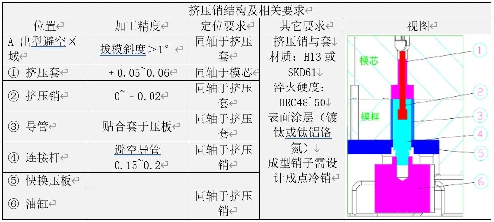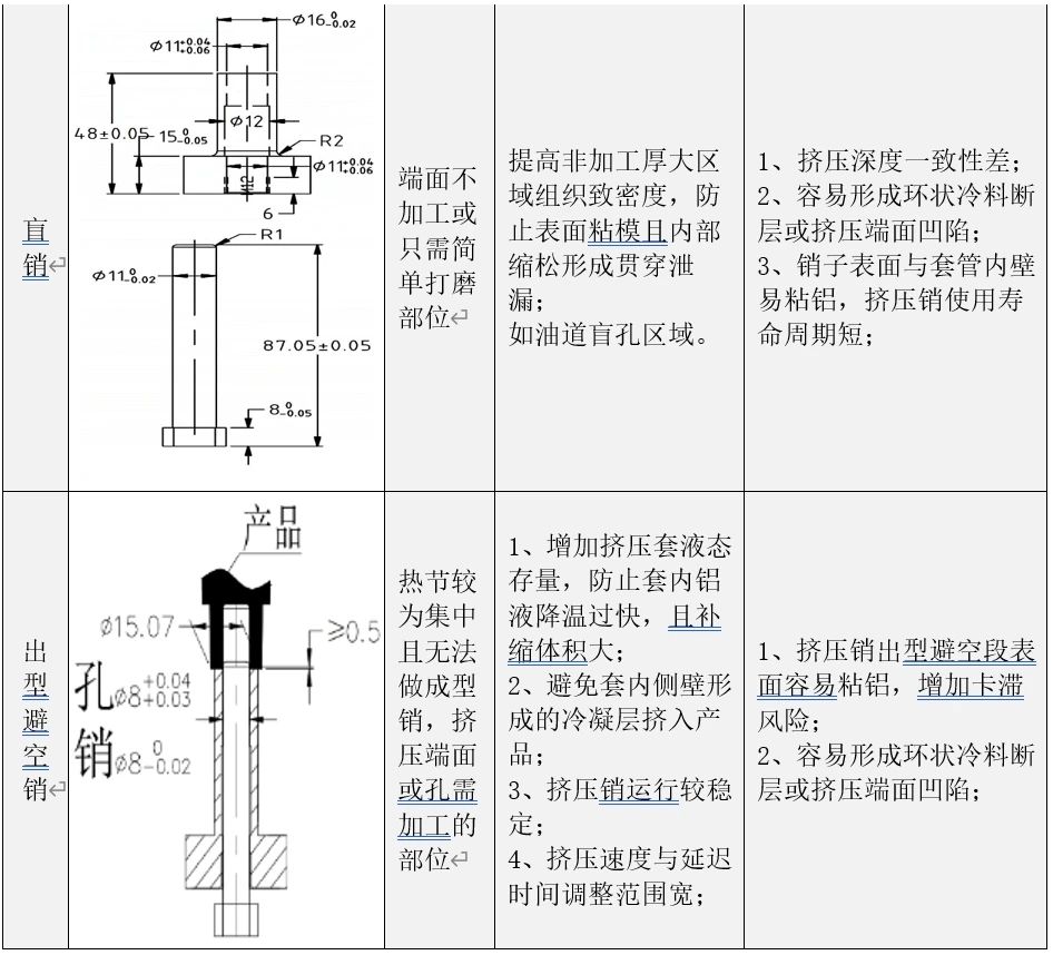 表3 擠壓銷結構及相關要求 03擠壓銷的幾個關鍵參數 1)擠壓延時:擠壓延時通常指型腔充填完成或者增壓啟動開始,至擠壓銷啟動這段時間。延時過短,整個型腔金屬處于全液態狀態,金屬液尚未達到固-液相轉變溫度,在此階段型腔內金屬液流動性好,可通過澆道在鑄造壓力作用下得到整體補縮,但不能達到厚大區域局部補縮的目的;延時過長,用于擠壓補縮的金屬液或需補縮部位的液體已凝固,喪失流動性,從而失去補縮的功能;正確的延時是需補縮的區域已成為孤立的固-液相區,其周邊通道已經固化,擠壓補縮于厚大部位的最后凝固區。 2)持壓時間:是指擠壓銷開始施壓到施壓結束這段時間。該段時間的長短以被擠壓區域金屬液固化,擠壓區域不產生溢流珠為最短合適的時間,多則無益。該時間段的長短受被擠壓熱節區域體積大小,模具溫度,鋁液溫度變化影響。