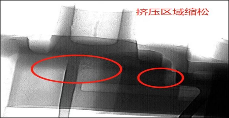 V1=S1×T×A 4)擠壓區域溫度:該溫度是指由熱節區域合金液溫度,模具溫度,擠壓銷溫度所共同構成的“溫度場”,該“溫度場”的穩定與否直接關系到擠壓的效果。 綜合所述,擠壓銷的擠壓效果如何,一方面取決于上述參數設置是否合理。另一方面取決于各參數是否穩定,特別是“溫度場”的相關參數。在實際生產過程中,需多次驗證,通過產品外觀,擠壓深度,X射線探傷等判定是否達到擠壓效果,從而固化并穩定相關參數。 04案例分享