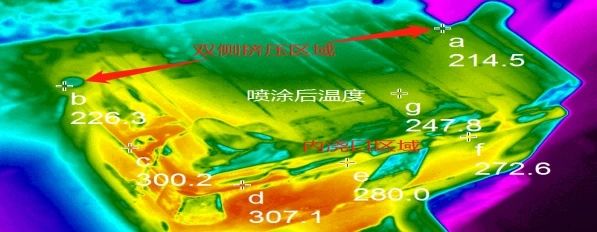 圖2 高壓油道擠壓區域缺陷 通過模具溫度測量,發現右側高壓油道擠壓區域噴涂后溫度偏高,“溫度場”發生變化,液態量因此增多,影響擠壓銷施壓效果。“圖3”中,右側溫度為214.5℃。