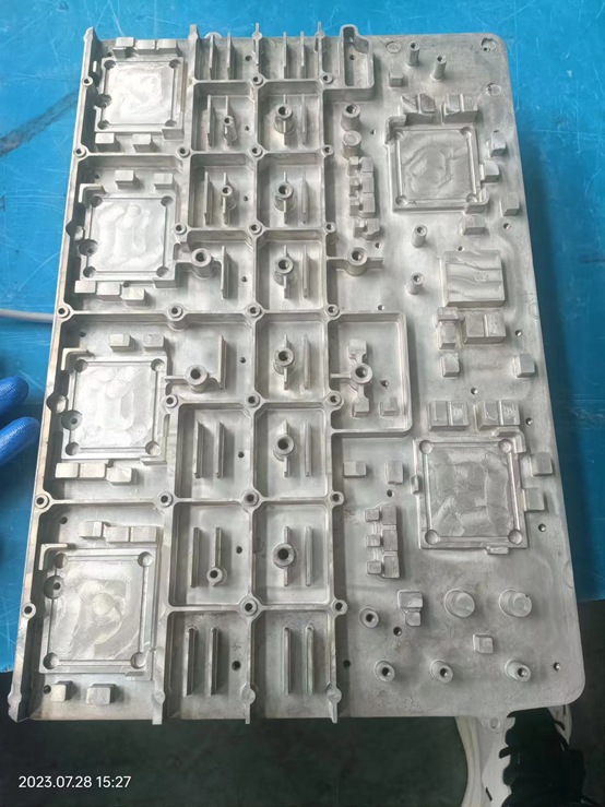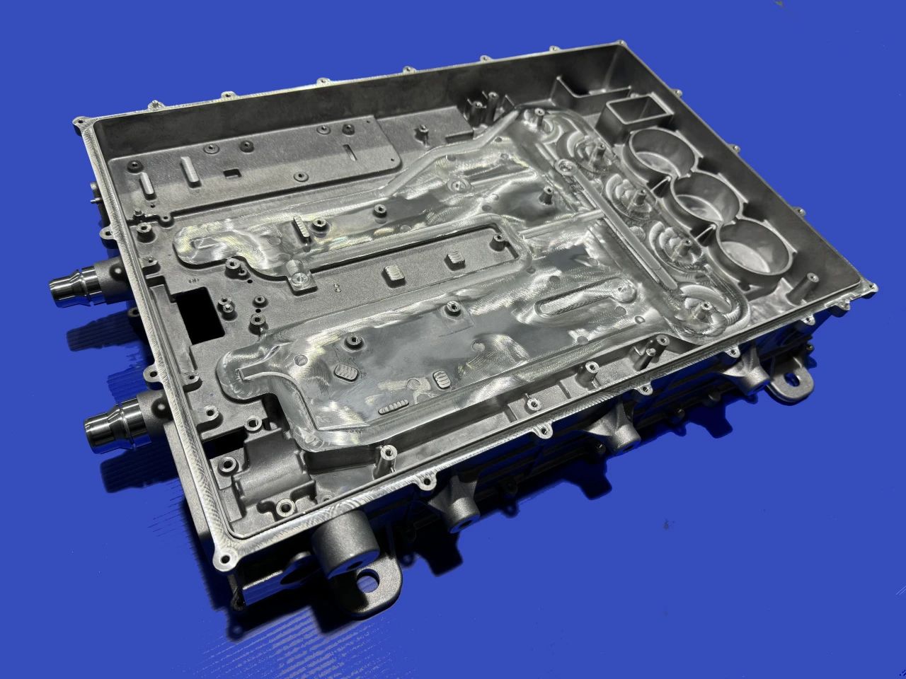 新能源電動汽車電控箱殼體整套成功的壓鑄模具開發是集材料、熱處理、模具設計、壓鑄工藝、加工、裝配工藝、管理、品控等多項技術系統整合及運用,是一個龐大的系統工程。其中壓鑄工藝方案設計是非常重要的一環,工藝的合理性直接影響鑄件的質量和后續生產加工環節。電控箱殼體結構復雜,內部質量要求高。如螺紋加工不允許有爛牙、氣孔率要求≤2%等。對此類復雜型壓鑄件,良好的壓鑄工藝設計方案對產品的質量起著決定性作用。 針對難點公司采取澆排系統設計與抽真空方案,壓鑄模具在高溫高壓環境下工作,對模具材料和抗熱疲勞性能要求高,而且結構復雜、壁厚相差大,并要求通過高壓下的滲漏試驗,因此鑄造中產生的能夠導致泄漏的氣縮孔、粘模等缺陷是首先需要規避的。選擇符合壓鑄工藝要求澆排系統,特別是內澆口位置和導向,應使金屬液流動平穩順暢,并有序的排除型腔內氣體,以達到良好的填充效果和避免壓鑄缺陷產生的目的。通過對產品的結構及性能要求分析,進行澆排設計。首先采用鑄造仿真軟件對產品的澆注和排溢系統進行充填、粒子追蹤、氣壓、溫度、凝固等過程的數值模擬分析,其次根據分析結果來確認方案設計的合理性,最終通過生產試驗進行工藝設計方案的合理性驗證。 鑒賞鑄件二 鑄件名稱:水冷板