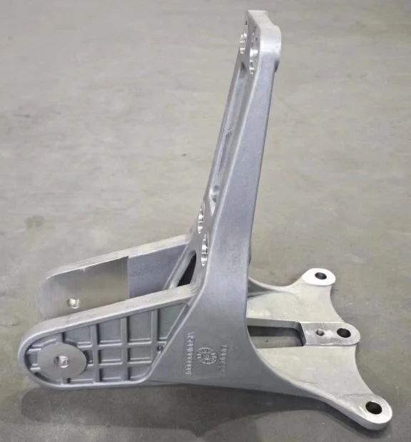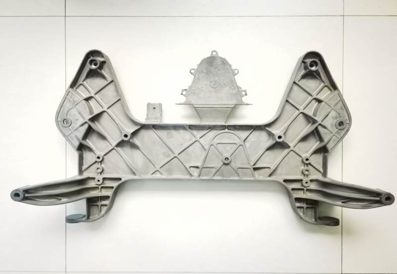 本產品是汽車制動系統的核心部件。該閥體具備兩側對稱結構,用于裝配繼動閥組件,實現兩側獨立控制。閥體頂部通過螺釘連接,用于安裝控制器組件。閥體底部通過卡扣連接,用于安裝消聲器組件。 參與企業:機械科學研究總院(將樂)半固態技術研究所有限公司 鑒賞鑄件一 鑄件名稱:車身上托架