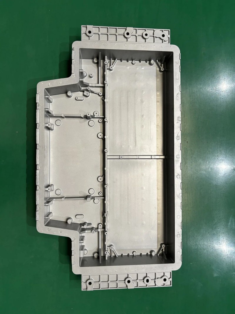 該鑄件為半固態研究所與廈門格耐爾公司聯合開發。醫療用橡膠、丁腈手套的首要工裝-手模,一直以來采用陶瓷型,雖能滿足功能性要求,但其存在能耗大、易破損、無回收等缺點,改用易回收金屬型成為研究熱點,鋁合金以其質輕成為研究首選。但由于手模部件具有薄壁、帶復雜空腔,需要與型材拼焊、使用受熱(200-300℃反復受熱)等特殊要求,采用普通壓鑄、型材沖壓等多種方案制備均存在多種問題,不能滿足生產項目要求。采用勻加速料筒孕育半固態壓鑄技術,在普通覆膜砂芯基礎上,開發成功了可高溫熱處理、可氬弧焊的手模空腔鑄件,在一定程度上解決鹽芯制造工藝復雜、成本高的局限性,為高質量、高效、低成本空腔壓鑄件大批量生產打下了堅實的基礎,具有廣闊的應用發展前景。 參與企業:寧波奮達新能源科技有限公司 鑒賞鑄件一 鑄件名稱:電控箱體