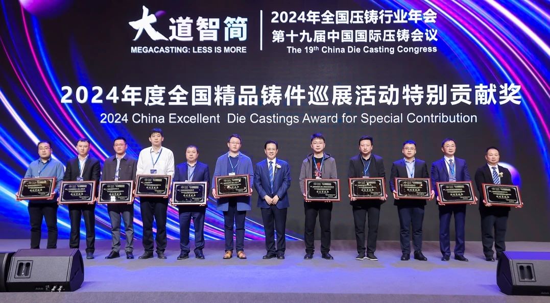2024年壓鑄教培專家聘任儀式 匠心鑄就輝煌:精品鑄件頒獎儀式 此次會議同期舉辦了2024全國壓鑄行業(yè)精品鑄件巡展活動,不僅彰顯了壓鑄行業(yè)的技術(shù)實力,更為行業(yè)的發(fā)展樹立了新的標(biāo)桿,推動了整個行業(yè)的技術(shù)進步和創(chuàng)新。會議開幕式期間,主辦方向鴻特、亞明、天正模具、奮達(dá)、將樂半固態(tài)所、勝賽思、DGS、多利、一汽鑄造、萬安、維士因等,這些展現(xiàn)卓越工藝與品質(zhì)的精品鑄件生產(chǎn)企業(yè)頒發(fā)榮譽獎項,以表彰其推動行業(yè)進步的特殊貢獻(xiàn),由中國機械工程學(xué)會鑄造分會副理事長、清華大學(xué)熊守美教授為其頒獎。