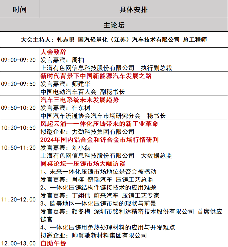 亮點介紹 論壇的首要亮點是聚焦壓鑄產業熱點議題 十一篇專題報告以及一項圓桌論壇研討,此次會議更設有企業參觀環節。演講嘉賓來自壓鑄行業內的知名企業,邀請到中國電動汽車百人會 副秘書長師建華為大家講解新時代背景下中國新能源汽車發展之路。中國汽車流通協會汽車市場研究分會秘書長崔東樹為大家帶來了汽車三電系統未來發展趨勢。舍弗勒(上海)貿易有限公司輕量化工藝經理/高級工程師彭亮為大家帶來新能源汽車電驅動殼體壓鑄的難點及解決方案,中國長安重慶底盤系統分公司/辰致科技有限公司渝北基地經理唐曉亮帶來長安一體化壓鑄工藝開發進展。 更設有圓桌論壇—壓鑄市場大咖訪談大咖訪談環節,奇瑞汽車壓鑄工藝總監肖榕、蔚來汽車壓鑄工藝專家丁翊偉、深圳市銘利達精密技術股份有限公司首席供應鏈官顏冬梅共同探討壓鑄技術與市場前景。 論壇的第二大亮點是壓鑄產業上下游人士集聚,共建上下游合作新平臺 目前已確認出席的部分鋁鑄件企業:上汽集團,廣汽集團,蔚來汽車,小米汽車,長安汽車,第一汽車,吉利汽車集團,合眾新能源,瑞浦蘭鈞,德業,奇瑞汽車,雅迪,海斯坦普,伊頓,舍弗勒,費斯托,安川電機,博格華納,顧家家居,海大嘉華,華域麥格納,九牧,馬瑞利,友達光電,華榮科技......,終端企業對鋁鑄件和鋁合金材料關注度很高。 出席本次會議的部分鋁鑄件生產企業:愛柯迪,寧波海威,蘇州金澄,艾蒂盟斯,山東利信,吉達克,上海嘉朗,山東宏燦,艾斯迪,蘇州利達,華川壓鑄,叁峰液鍛,銘利達,優尼科,江蘇飛亞,東莞宜安...... 以及鋁合金材料生產企業:安徽雄創,寧波鑫林,寧波新邦,上硅,浙江永記,山東宏順,安徽新太等。 論壇的第三大亮點是設立展區