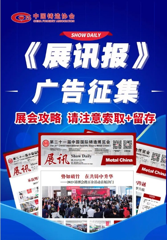 ![]() 各鑄造相關企業: “第二十二屆中國國際鑄造博覽會”“第十七屆中國國際壓鑄工業展覽會”“第十七屆國際有色及特種鑄造展覽會”將于2024年7月4-7日在國家會展中心(上海)舉辦。作為“鑄博會”展期主辦報刊,《展訊》聚焦展期重要信息、匯集會展活動資訊、展示展商魅力風采、指引觀眾便捷觀展,在展期面向所有展商和觀眾發行,是便于各方聯絡與對接必不可少的展期指南,更是人手一份不能錯過的觀展攻略。