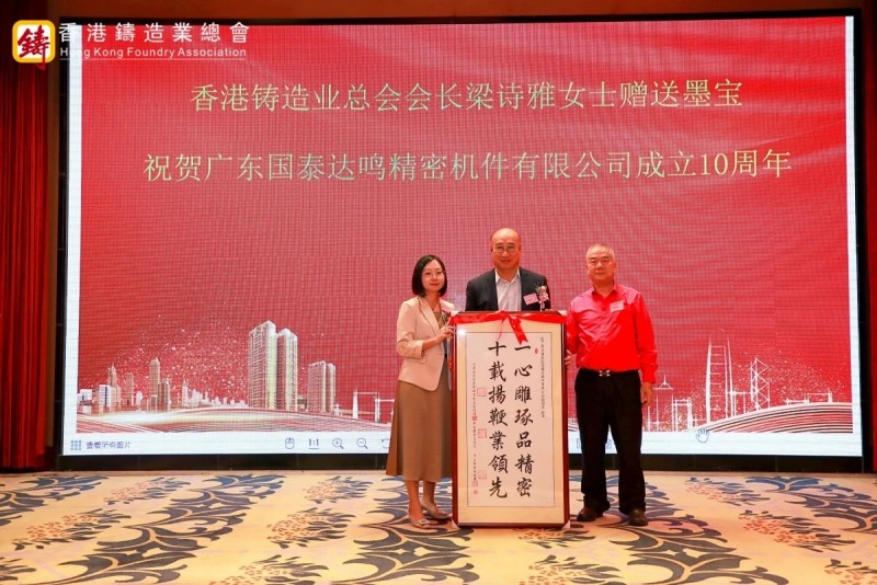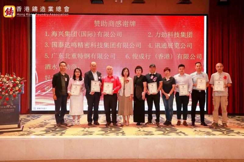 隨后,大會進行了簡約而隆重的頒牌儀式。梁詩雅女士代表總會為四家永久會員企業(yè)代表頒發(fā)了證書和盾牌,分別為湖南鑫泉科技有限公司、廣東啟新模具有限公司、蚌埠隆華壓鑄機有限公司、廣東賽宏精密清洗裝備有限公司。總會向本次大會大力支持的七家贊助商表達了誠摯的感謝,分別為海興集團(國際)有限公司、力勁科技集團、國泰達鳴精密科技集團有限公司、廣東北重特鋼有限公司、俊成行 (香港) 有限公司、訊通展覽公司、肆拾玖坊頒發(fā)感謝狀。