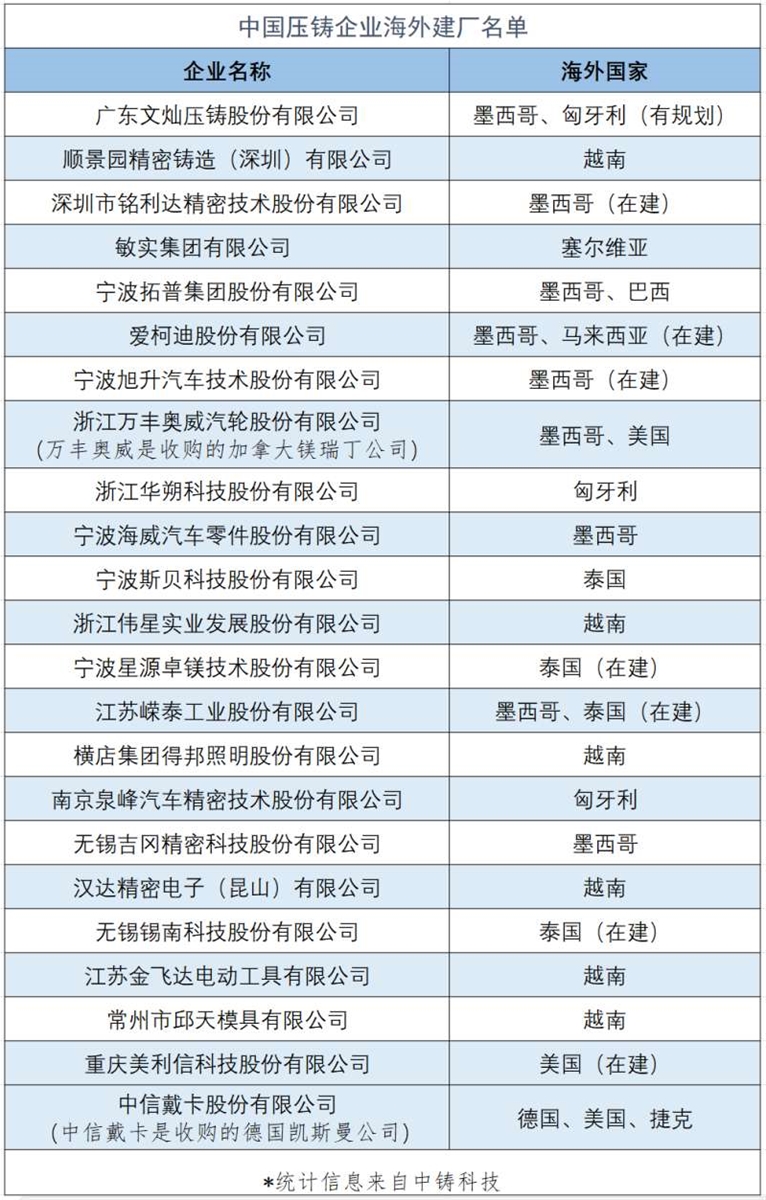 ![]() 近年來,隨著壓鑄企業(yè)“國際化”步伐的加快,許多國內(nèi)企業(yè)紛紛在歐洲、美洲、東南亞等全球投資設廠,這一趨勢已經(jīng)成為行業(yè)內(nèi)的熱門話題。為了給業(yè)界提供參考,特此整理了在海外建廠的中國壓鑄企業(yè)名單。
