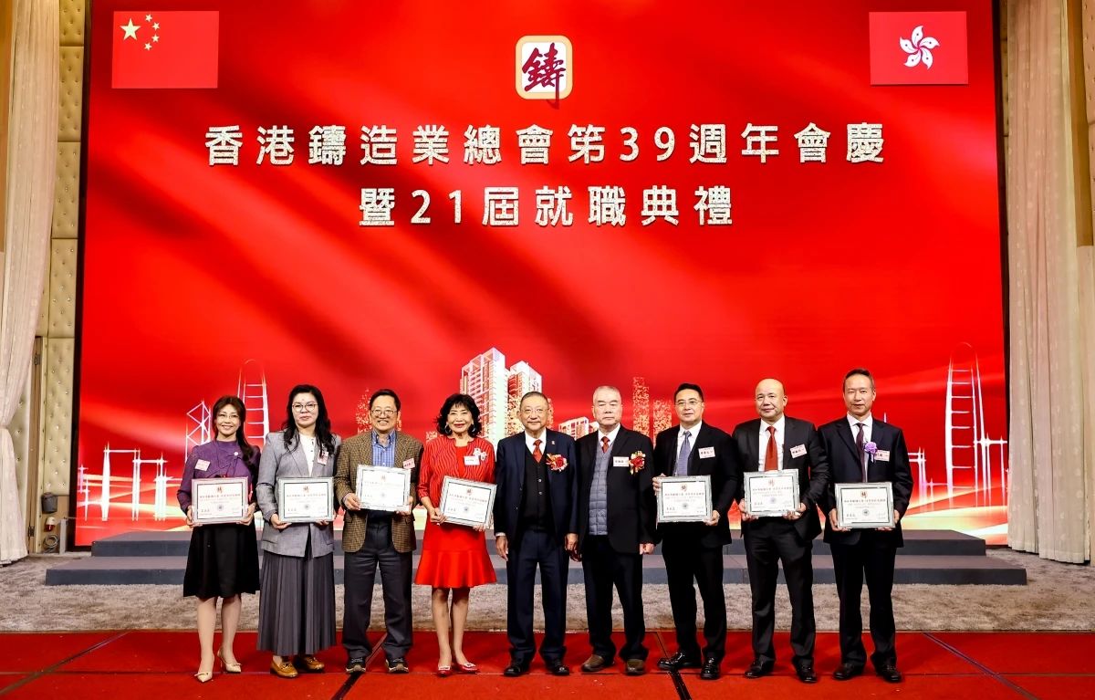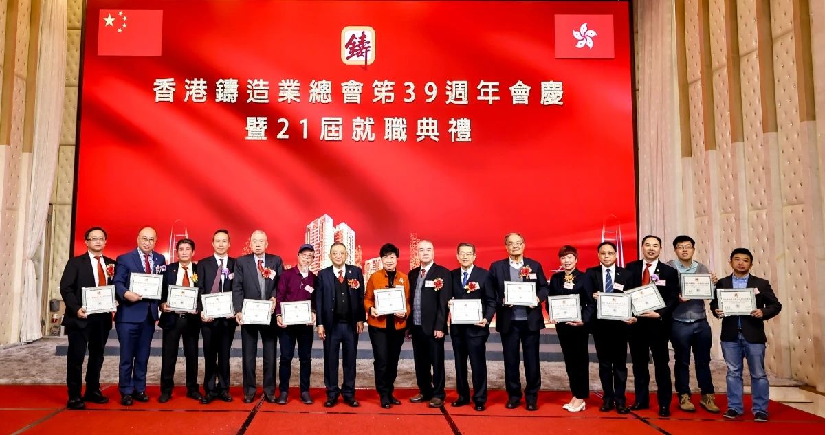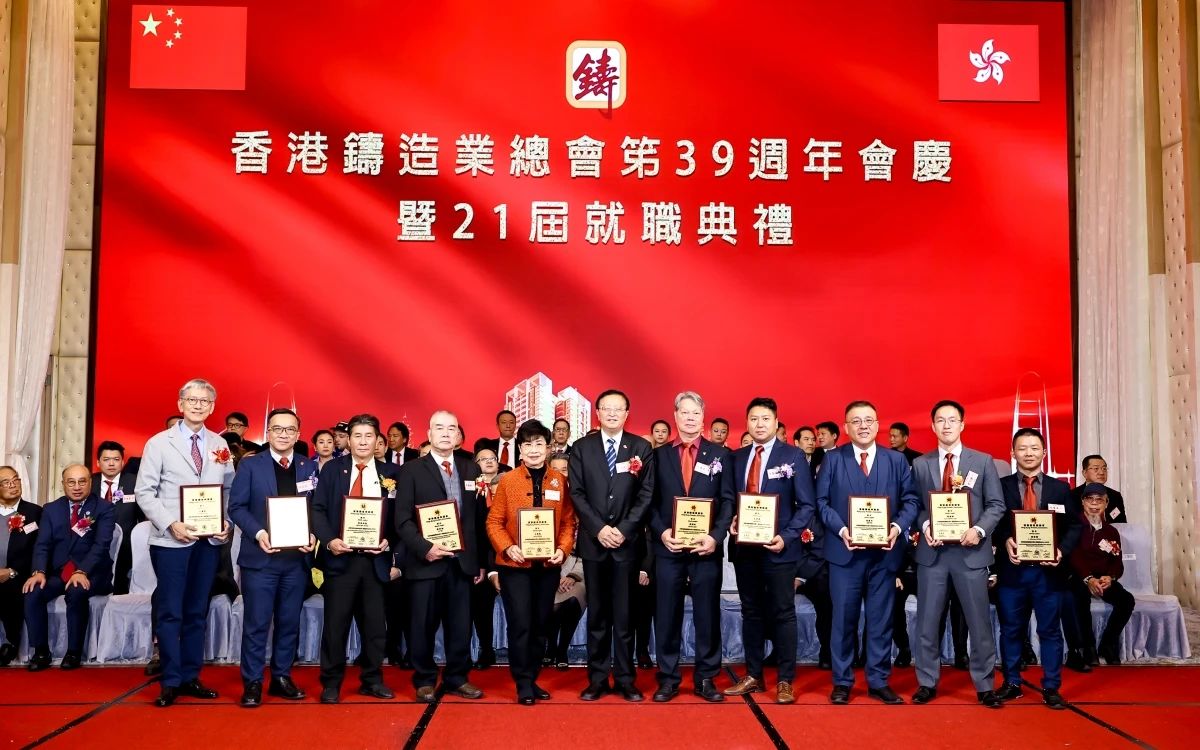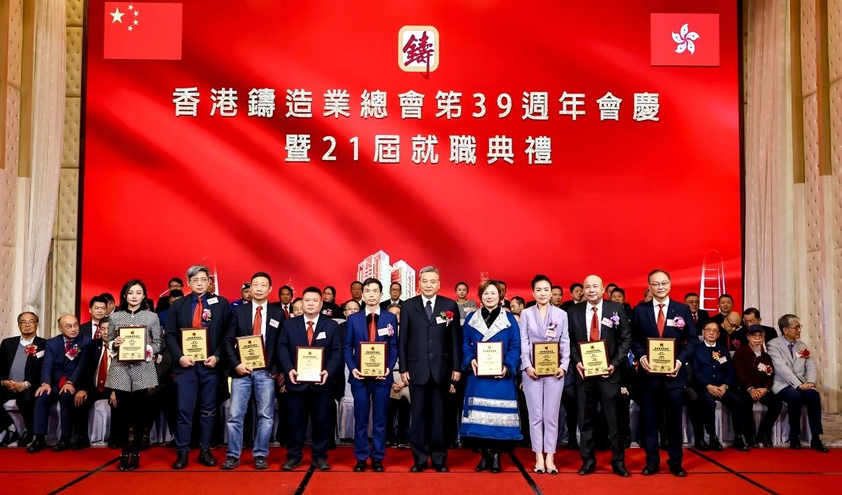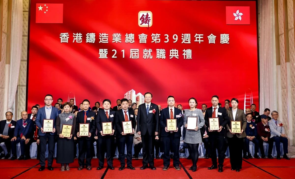 ![]() 璀璨香江,熠熠生輝。2024年12月16日,香港鑄造業總會第39周年會慶暨第21屆理事會架構成員就職典禮,在香港九龍灣百樂金宴國際宴會廳隆重舉行。這一盛會不僅見證了香港鑄造業總會新一屆理事會架構成員的正式就職,更彰顯了香港鑄造業的團結與蓬勃活力。 香港商務及經濟發展局副局長陳百里博士,中央人民政府駐香港特別行政區聯絡辦公室經濟部副部長兼貿易處負責人周強先生,亞洲鑄造業聯合會當值主席、中國機械工業聯合會副會長、中國鑄造協會會長張立波先生,中國機械工程學會鑄造分會副理事長、中國機械總院集團沈陽鑄造研究所有限公司董事長謝華生先生,中國共產黨十八大、十九大代表、中國鑄造協會名譽會長、共享集團股份有限公司董事長彭凡先生,以及來自全國鑄造行業的兄弟協會/學會領導、香港鑄造業總會會員企業代表、專業媒體記者等500余名嘉賓,共同見證了這一重要時刻。