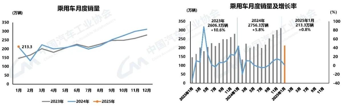 ![]() 2月17日,中國(guó)汽車工業(yè)協(xié)會(huì)發(fā)布了2025年1月汽車工業(yè)產(chǎn)銷情況。1月,汽車產(chǎn)銷分別完成245萬(wàn)輛和242.3萬(wàn)輛,環(huán)比分別下降27.2%和30.5%,產(chǎn)量同比增長(zhǎng)1.7%,銷量同比下降0.6%。 中國(guó)汽車工業(yè)協(xié)會(huì)表示,今年1月我國(guó)汽車行業(yè)總體保持穩(wěn)定運(yùn)行。其中,乘用車延續(xù)良好表現(xiàn),產(chǎn)銷量同比雙增;新能源汽車產(chǎn)銷和汽車出口也延續(xù)了良好態(tài)勢(shì)。 數(shù)據(jù)顯示,1月乘用車產(chǎn)銷分別完成215.1萬(wàn)輛和213.3萬(wàn)輛,同比分別增長(zhǎng)3.3%和0.8%。