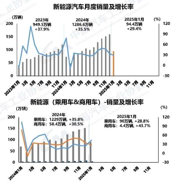 在新能源汽車方面,1月新能源汽車產(chǎn)銷分別完成101.5萬(wàn)輛和94.4萬(wàn)輛,同比繼續(xù)保持較快增長(zhǎng),分別增長(zhǎng)29%和29.4%。新能源汽車新車銷量占汽車新車總銷量的38.9%。