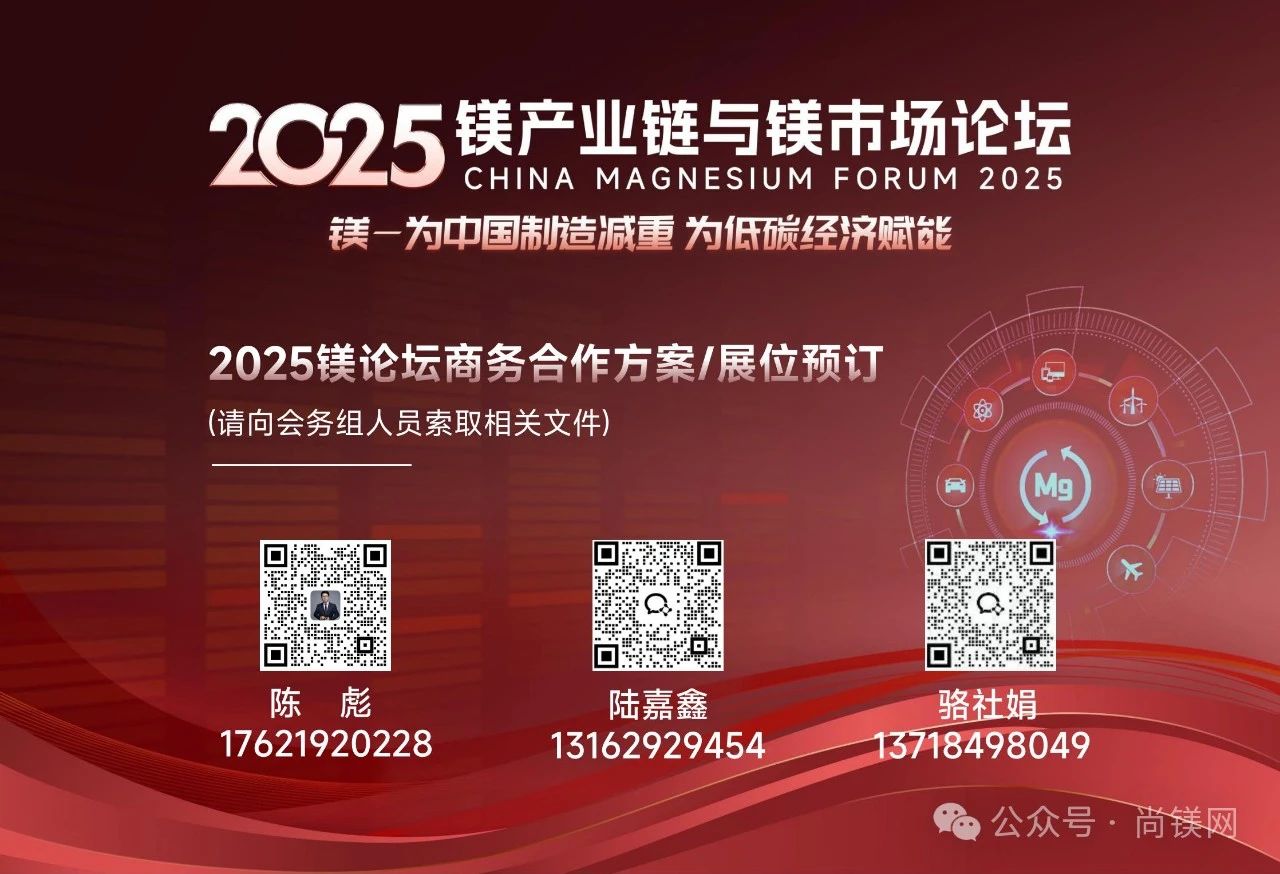 其他演講人及題目,即將陸續確認并發布,敬請關注!(報告如有變化,以現場安排為準) 邀請參會人員 鎂及鎂合金材料生產企業、鎂合金加工生產企業、鎂合金用戶及零部件制造企業(汽車及交通、3C、消費品、建筑、機械、工具、新能源等)、鎂研發及學術機構、鎂貿易商、相關裝備制造和原輔材料供應商、投融資機構、工業園區及產業鏈其他相關單位。 為增強會議的交流效果,對重要鎂及鎂合金終端用戶單位代表免收注冊費。 論壇預注冊 參會注冊辦法及通道即將發布。可線上和線下預注冊。注冊成功后可按照提示辦理提前匯款和房間預訂手續! 鎂合金終端用戶單位可申請免費(每公司僅限免1人,需經主辦方提前確認,額滿為止。鎂及合金終端用戶單位指:汽車、自行車、摩托車整車廠;手機、電腦、通訊器材、工具、休閑用品、飛機等終端產品制造商/品牌商,不含零部件廠商。免費解釋權在主辦方。) 展位預訂與商務合作 鎂產業鏈相關人士將集聚,共商共議構建新型鎂產業生態鏈,將成為鎂業界商務合作的新平臺和最佳機會。主辦方將為支持單位提供展示新理念、新成果、新產品,交流新技術、新信息的最佳窗口。 期待您的企業利用如下商務合作方式,開拓新商機: 會議協辦單位、支持單位(附有回報方案) 會場展位、廣告預訂(數量有限,先訂先得) 宴會、午餐、晚餐、茶歇冠名 代表禮品贊助、信息發布、資料發送等 2025鎂論壇商務合作方案/展位預訂 請聯系會務組人員索取相關文件并對接