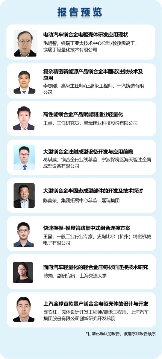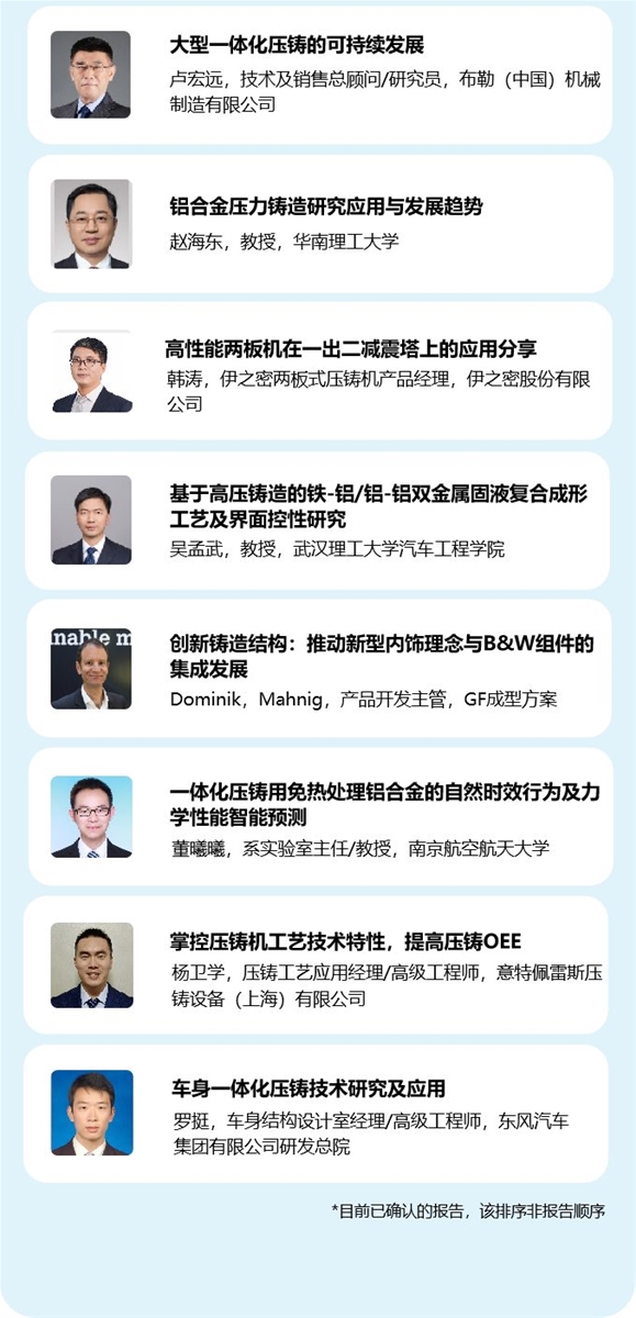 除了邀請來自中國大陸、中國香港、中國臺灣的行業專家作報告外,大會還將著重邀請國際知名專家共同探討全球壓鑄技術、工藝、材料及行業趨勢等話題。其中,美國科羅拉多礦業大學教授Dr. Steve Midson將以《北美壓鑄行業現狀》為題作報告;德國萊茵費爾登有限公司研發主管Dr. Stuart Wiesner將以《新型鋁合金在壓鑄結構件中的可持續發展與應用》為題作報告。 主會場:技術報告