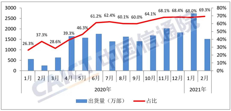 ![]() 中國信通院發布發布數據,2月國內手機市場總體出貨量2175.9萬部;同比增長240.9%。1-2月,國內手機市場總體出貨量累計6187.9萬部,同比增長127.5%。 2月,國內市場5G手機出貨量1507.1萬部,占同期手機出貨量的69.3%。1-2月,國內市場5G手機出貨量4234.9萬部,占比達68.4%。
