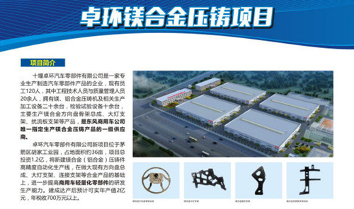 十堰廣播電視臺報道,3月24日,湖北十堰市第二批重大開工項目之一,卓環鎂合金壓鑄項目,由十堰卓環汽車零部件有限公司投資建設,主要生產鎂合金汽車壓鑄件。