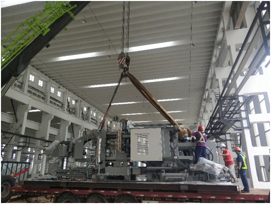 8月15日,首批生產(chǎn)設(shè)備進(jìn)場(chǎng)。圖為1000T壓鑄機(jī)吊裝。