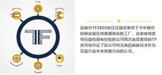 為什么"無曲拐"是江中光電的未來 與基于帶曲拐的三板機設計相比,意特佩雷斯高斯的TF無曲拐兩板機系列高壓壓鑄機提供更小的設備占地面積,更強的剛性和更少的易損件,以提高可靠性和性能。這一組合完美地滿足了江中的需求,同時在生產中對環境更友好。 我們與意特佩雷斯高斯的合作已經超過15年,意特的高壓壓鑄設備始終保持在非常高的水平上,提供一致的穩定性和先進性,這對我們的生產至關重要。 --許應龍先生, 南通江中光電有限公司董事長 精益和高效的TF系列體現出了超強的生產能力。隨著大型鑄件成為壓鑄市場的焦點,兩臺新的TF2800和TF5700組成了一個范圍較廣的生產范圍,滿足了適應不斷變化的市場對壓鑄機的鎖模力要求。 服務支持是提升產能的關鍵 將南通的工廠運行壓鑄機總數增加到十臺,江中光電預計能夠將年產能提升至120萬級套梯級產品,在此基礎上進一步擴大超大型及大型汽車零部件的研發和生產。新的兩臺TF高壓壓鑄機將由意特佩雷斯高斯中國常州的生產基地制造,同時也由國內團隊提供技術支持與售后維護。