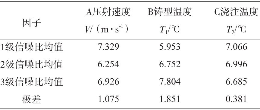 表3 虛擬工藝參數正交試驗結果 從表3可以看出,在上述9組試驗中,在沒有干擾因素的影響下,第1組壓鑄工藝參數的缺陷體積最小,相比質量更穩定。 信噪比的值對應于各因素的水平。通過計算各級各因子的信噪比均值,進一步獲得了信噪比因子水平的極差值。可以預測出針對試驗目標響應的測試因子的最佳組合,即一套保證了產品質量的最穩定壓鑄工藝參數。同時,極差值的大小表示了相應因素的影響大小,極差值較大,表明該因素較活躍,其變化對結果影響也很大;極差值較小,其變化對結果影響也很小。該算法簡單、直觀,易于使用。在表4列出了信噪比均值和不同級別因素的極值的對比結果。 從表4可以看出,極差值最大對應的是鑄型溫度,最小對應的是澆注溫度,因此,試驗因素的順序是鑄型溫度、壓射速度和澆注溫度。表4中各因素的平均信噪比用圖3表示,可以更直觀地解釋工藝參數對缺陷的影響。從圖3可以看出,當壓鑄工藝參數的組合為A1B3C1時,信噪比最大,即壓鑄件的質量穩健性最好。此時,壓射速度為0.9 m/s,鑄型溫度為260 ℃,澆注溫度為680 ℃,與上述9組試驗中第9組工藝參數正好吻合。若上述9組試驗中沒有優化得到的工藝參數組合,需要重新模擬和驗證。