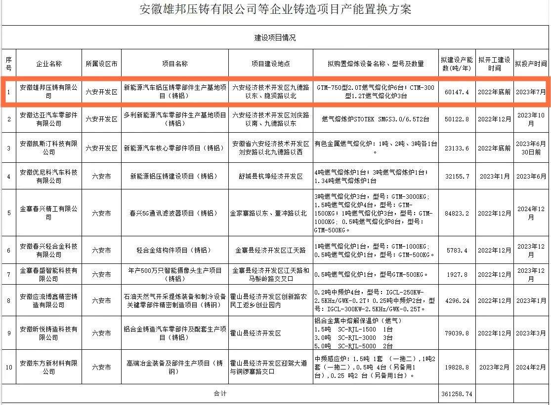 ![]() 近日(1月6日),安徽省經濟和信息化廳在其官網公示了安徽雄邦壓鑄有限公司等企業鑄造項目產能置換方案。據悉,安徽雄邦壓鑄有限公司系文燦集團股份有限公司(簡稱“文燦集團”)全資子公司,注冊資本1億元。 公告顯示,此次安徽雄邦壓鑄有限公司(簡稱“安徽雄邦”)擬在安徽六安經濟技術開發區建設新能源汽車鋁壓鑄零部件生產基地項目(鑄鋁),擬置換產能60147.4噸。預計于2023年7月投產。