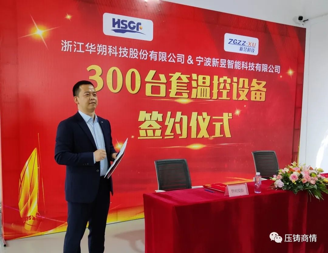 華朔股份CEO沈善忠先生、新昱科技總經(jīng)理王蘇華先生分別在簽約本上簽字 在活動(dòng)現(xiàn)場(chǎng),浙江華朔科技股份有限公司CEO沈善忠先生、寧波新昱智能科技有限公司總經(jīng)理王蘇華先生分別致辭,并在簽約本上簽字。根據(jù)協(xié)議,華朔股份向新昱科技采購(gòu)300臺(tái)套壓鑄溫控設(shè)備,并于未來(lái)三年每年采購(gòu)數(shù)百臺(tái)溫控設(shè)備,用于新上壓鑄單元及原有壓鑄生產(chǎn)線的設(shè)備升級(jí)改造。