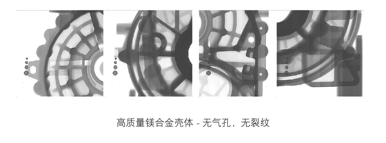 豐富的開發經驗 GF成型方案在鎂合金殼體的開發和量產上擁有豐富的歷史經驗,GF歐洲曾為歐洲主流OEM成功量產了鎂合金變速箱殼體、鎂合金齒輪箱殼體等并得到了客戶的長期認可。基于GF歐洲積累的成熟開發經驗,GF中國近日在鎂合金電驅殼體領域取得了階段性的試制成功。 先進的模具技術 在外觀上,GF中國通過先進的模具開發能力、精確的壓鑄工藝控制,實現了鎂合金殼體表面比鋁合金殼體表面更亮、更光滑,符合汽車行業的嚴格外觀標準。GF中國對殼體外部尺寸與內部結構進行3D掃描與全尺寸檢測,并借助高精度 X 光嚴格檢測產品內部氣縮孔。測試發現:GF中國試制的鎂合金殼體展現出了優異的內部質量,尤其是產品厚大位置及關鍵加工區域內部質量優于鋁合金殼體。在加工后的油水路泄露測試環節,GF中國試制的鎂合金殼體同樣表現優異,泄露測試通過率達到100%,確保了殼體在各種工況下都能保持良好的密封性。