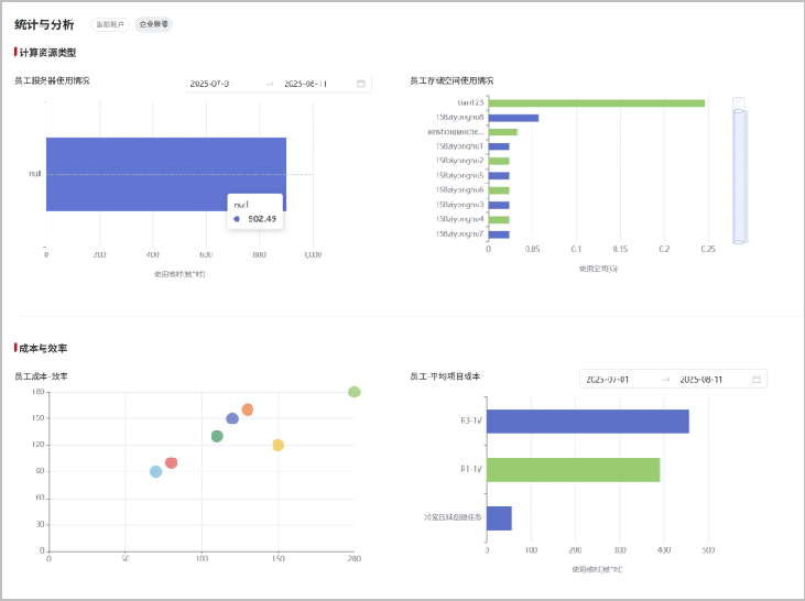 仿真結果多視口對比 這意味著,花費時間導出、下載大型文件交給專家離線分析的工作過程被徹底解體,團隊只需在瀏覽器里就能交流結果并立即給出工藝建議,非仿真專業的項目經理/企業高管也能第一時間看懂“哪里可能出現問題”,大大加快決策鏈條。 03 企業級協同與數據管理:全面升級的知識資產 智鑄超云3.0還為個人和企業用戶提供了資源監控與標簽統計功能;同時優化業務流程,新增項目看板,以溯源、查看往期項目和團隊的不同項目,收藏仿真結果,解決原有架構任務追溯困難、多任務協同低效的痛點。