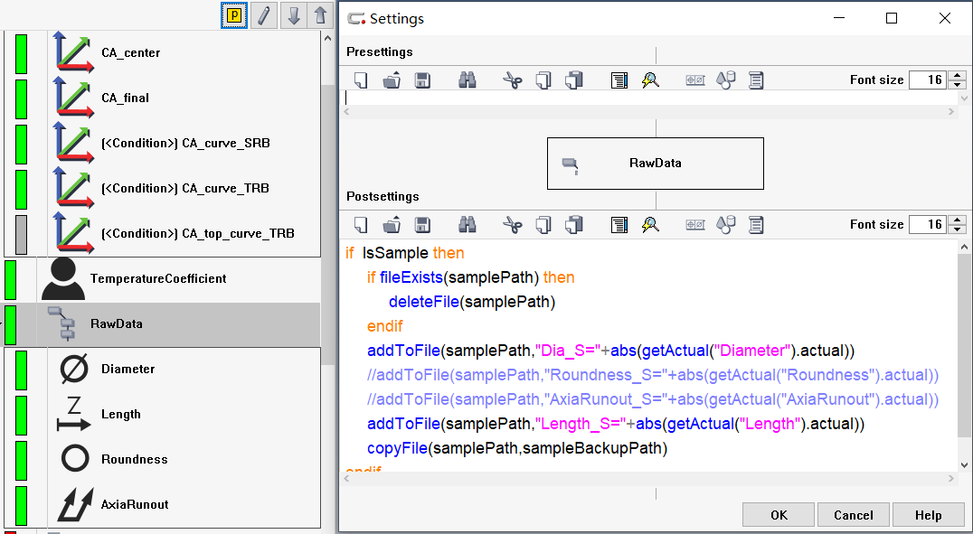 上圖展示了一部分程序界面,如果我們沒有PCM模塊,可否實現根據零件的尺寸設置測量策略的功能呢?答案是可以的! 軟件中默認提供了6種通用策略,他們根據不同的探頭類型分為功能性檢查和過程能力分析類檢測,它們只能調用,不可編輯。