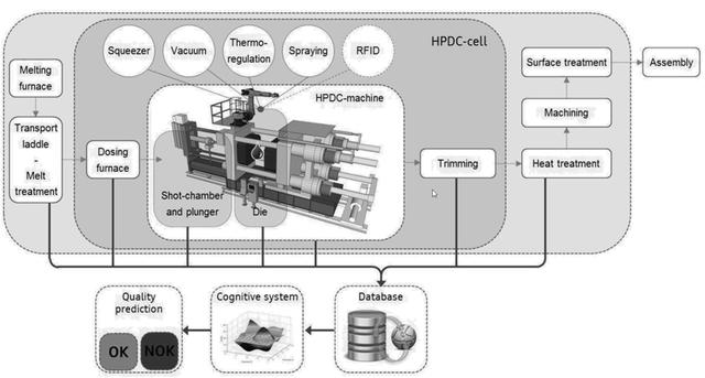 圖3歐洲MUSIC項(xiàng)目智能工廠實(shí)施方案 鑄件內(nèi)部質(zhì)量監(jiān)控 隨著汽車工業(yè)的不斷發(fā)展,對(duì)零部件質(zhì)量的要求越來(lái)越高,大的汽車生產(chǎn)商不斷制定出針對(duì)零部件內(nèi)部質(zhì)量的要求,定量地規(guī)定零部件內(nèi)部缺陷可以存在的標(biāo)準(zhǔn)。在這種情況下,零部件供應(yīng)商在生產(chǎn)過(guò)程中,必須能夠?qū)崟r(shí)地檢測(cè)并標(biāo)定所有鑄件內(nèi)部的缺陷分布情況,并對(duì)比標(biāo)準(zhǔn)以評(píng)定鑄件是否滿足要求。 那么如何正確地觀測(cè)并記錄鑄件內(nèi)部的缺陷呢?現(xiàn)有技術(shù)中最好的技術(shù)是計(jì)算機(jī)斷層掃描,也就是我們俗稱的CT技術(shù)。CT技術(shù)已經(jīng)被廣泛地應(yīng)用在醫(yī)療領(lǐng)域,將CT技術(shù)應(yīng)用于工業(yè)檢測(cè)還是近幾年剛興起的技術(shù)。 將CT技術(shù)應(yīng)用于鑄件內(nèi)部質(zhì)量的檢測(cè),必須滿足以下幾個(gè)要求: 第一,檢測(cè)的速度必須足夠高,以配合鑄件的實(shí)時(shí)生產(chǎn)過(guò)程; 第二,檢測(cè)所獲得的圖像質(zhì)量必須足夠好,以配合后續(xù)軟件對(duì)圖像的精確識(shí)別; 第三,在保證精度的情況下,識(shí)別圖像的軟件或算法必須足夠快,從而不至于拖延生產(chǎn)進(jìn)度。 其中,前兩個(gè)要求是針對(duì)CT檢測(cè)本身提出的,而最后一個(gè)則是針對(duì)檢測(cè)軟件或算法提出的要求。快速檢測(cè)CT設(shè)備(Speed-Scan)已經(jīng)被德國(guó)大眾公司用于實(shí)際鑄件的檢測(cè)了。但是縱觀國(guó)內(nèi)壓鑄產(chǎn)業(yè),使用實(shí)時(shí)CT技術(shù)對(duì)鑄件質(zhì)量進(jìn)行把控,從操作層面上來(lái)看具有嚴(yán)峻的挑戰(zhàn)性,其中最大的制約因素是成本——CT檢測(cè)設(shè)備造價(jià)極高,而將其用于生產(chǎn)線一般需要大量的CT檢測(cè)設(shè)備,這是國(guó)內(nèi)大部分企業(yè)無(wú)法承受的。而隨著產(chǎn)業(yè)的不斷發(fā)展以及對(duì)鑄件質(zhì)量要求的不斷提高,采用CT技術(shù)實(shí)時(shí)檢測(cè)鑄件內(nèi)部質(zhì)量會(huì)是今后一段時(shí)間內(nèi)主機(jī)廠對(duì)供應(yīng)商的普遍要求。