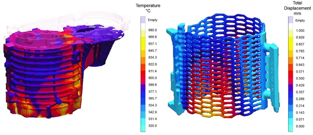 通過CT直接對(duì)比不同的鑄造缺陷(藍(lán)色為氣體,紅色為縮孔) 砂芯在鑄造過程中的變形 隨著輕量化設(shè)計(jì)需求的增加,以及由此造成的更薄的壁厚,由變形或砂芯斷裂而導(dǎo)致的與砂芯相關(guān)的鑄件缺陷越來越多。MAGMASOFT®5.5可以提供首次預(yù)測填充和凝固過程中砂芯的應(yīng)力,并防止由于砂芯變形或失效而導(dǎo)致的鑄件缺陷,此外,還能夠提供各種砂/粘結(jié)劑組合的大量材料數(shù)據(jù)。除了冷芯,邁格碼還特別關(guān)注預(yù)測無機(jī)砂芯的變形方式。這些獨(dú)特的功能避免芯斷裂,能夠預(yù)測局部尺寸偏差,并通過改進(jìn)芯盒設(shè)計(jì)實(shí)現(xiàn)砂芯變形的預(yù)補(bǔ)償,為用戶提供了更高的安全性。