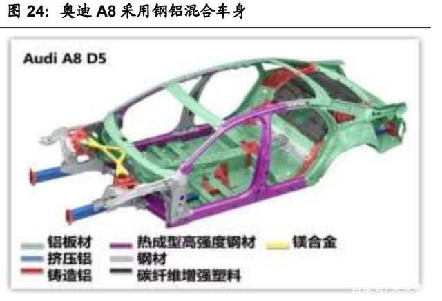 從白車身部位來看,防撞梁、發罩鋁合金的鋁合金應用門檻最低,其次是行李箱蓋、 翼子板及其它覆蓋件。包括 B 柱、縱梁、門檻、頂蓋縱梁等關鍵傳力結構件在內 的白車身本體對設備成本、節拍、連接工藝質量控制都有較高要求,應用鋁合金相 對較難。目前已知已經在開發或已經在應用鋁合金材料的有:電池托架、減震塔、 后 A 柱、D 柱、門框、座椅、后橋、后縱梁等。 車身用鋁行業增長空間巨大。根據國際鋁業協會的計算,純電動車用鋁最高可達 361.3kg,占整備質量的 33.1%。2018 年單車用鋁為 128.4kg,滲透率(實際用鋁 /理論用鋁最大值)為 31%,預計 2025 年單車用鋁達到 226.8kg,滲透率為 50%; 2030 年單車用鋁達到 283.6kg,滲透率為 56%。 汽車鋁壓鑄件向大型化、一體化發展 汽車壓鑄工藝主要分為鑄造、鍛造、沖壓三大類。 1)鑄造是將液體金屬澆鑄到與零件形狀相適應的鑄造空腔中,待其冷卻凝固后, 以獲得零件或毛坯的方法。分為壓力鑄造、擠壓鑄造等。采用鑄造工藝生產的 零件主要為殼體類和支撐類, 2)鍛造是一種利用鍛壓機械對金屬坯料施加壓力,使其產生塑性變形以獲得具 有一定機械性能、一定形狀和尺寸鍛件的加工方法。采用鍛造工藝生產的零件 主要為力學性能要求較高的零件,例如車輪、底盤懸架系統控制臂、轉向節、 空調壓縮機渦旋盤等。 3)沖壓是將原材料用合適的沖壓模具沖壓成型。是在常溫下用沖床等機器將半 成品做成成品的過程。汽車制造中 60%-70%的金屬零部件需要經過塑性加工, 沖壓是重要的手段,如各種覆蓋件、車內支撐件、架構加強件,以及發動機排 氣管及消聲器、空心凸輪軸、油底殼、發動機支架、框架結構件、橫縱梁等。 4)在汽車鋁合金壓鑄工藝中,壓力鑄造占比 80%左右,鋁合金擠壓件和鋁合 金沖壓件各占 10%左右。
