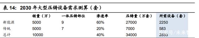 假設 2030 年全球乘用車銷量為 1 億輛,新能源滲透率為 50%,一體壓鑄可應用的 部位為前中后底板、電池包、電機電控殼體、副車架、車門*4、后蓋共計 9 個部位。 新能源車一體壓鑄滲透率為 60%,傳統車一體壓鑄滲透率為 30%,按照一臺大型 壓鑄設備出貨量 12 萬套計算,我們預計所需大型壓鑄機約為 2800 套。 內壓鑄機龍頭。 國內壓鑄機廠家約 100 家,具備一定市場規模的約有 20 家,主要分布在沿海地區。 2001 年-2010 年我國壓鑄機產量從 1960 臺增長為 5580 臺。