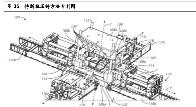 鋁壓鑄進入壁壘較高,國內鋁壓鑄企業均有自身優勢領域。鋁合金壓鑄行業屬于資 金與技術密集型行業,生產過程中的零件設計、模具制造、壓鑄、精密加工、工藝 優化等各環節均需要長期的技術積累,另外相關模具與壓鑄設備也需要大量資金投 入,市場進入壁壘高。廣東鴻圖主要做中大件包括動力總成系統、傳 動系統和新 能源汽車的結構件。鴻特精密的主要產品是應用于汽車發動機、變速箱及底盤制造 的鋁合金精密壓鑄件及其總成。愛柯迪的產品以中小件為主,覆蓋雨刷系統、轉向 系統、發動機系統、傳動系統等,主要客戶是一級供應商,變速箱和撥叉的市場份 額排名第一。 材料+方案+設備構成技術核心,自主零部件廠商具備先發優勢 材料:獨家鋁合金材料構成特斯拉一體壓鑄技術壁壘。早在 2015 年 12 月,特 斯拉就聘請了鋁合金專家查爾斯·柯伊曼,令其負責特斯拉的材料工程團隊。特 斯拉研發的鋁合金材料是獨家配方,具有強度高、導電性強的特點,因此穩定 性優異。由獨家合金材料壓鑄而成的后底板總成不需要再進行熱處理,可直接 進入下一工序,制造時間由傳統工藝的 1-2 小時縮減至 3-5 分鐘,極大的節省 了所需的生產時間,且能夠在廠內直接供貨。這一新型鋁合金材料是特斯拉的 獨家專利,保證了特斯拉在一體壓鑄應用上的技術壁壘。 方案:壓鑄方法專利有效促成大型部件落地。特斯拉申請專利:汽車車架的多 向車身一體成型鑄造機和相關鑄造方法。此方法獨創地將一套固定的模具放置 在中心,四套可以移動的模具放置在四個不同方向。可移動的模具通過液壓設 備分別與中心固定好的模具貼合,并共同形成一個封閉的空腔。熔融狀態的鋁 合金分別從四個移動模具上的澆筑口壓入模具空腔,鋁合金在空腔內流動、匯 合,最終鑄成大型的一體式壓鑄結構零件。