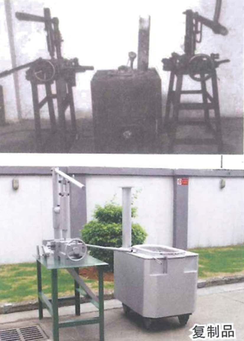 ▲ 圖1 地坑熔煉爐 (四)壓鑄產(chǎn)業(yè)的萌芽開花 1949年,廣州著名鎖廠中華泰記在香港創(chuàng)辦了華南鎖廠,此時廣州還有幾家鎖廠也到香港開廠,帶來了制鎖的機(jī)器和技術(shù)。這些以“前店后廠”形式經(jīng)營的新工廠及香港本地一些金屬制品廠,為了批量生產(chǎn)出質(zhì)量更好的鎖具,均開始了鎖具件的壓鑄技術(shù)研究。使用的首臺土法手動壓鑄機(jī),俗稱“馬騮機(jī)”(見圖2),是以人體質(zhì)量按下機(jī)器上方的手柄,打壓合金熔液,將之壓進(jìn)工模內(nèi)腔成型,壓鑄出零件。