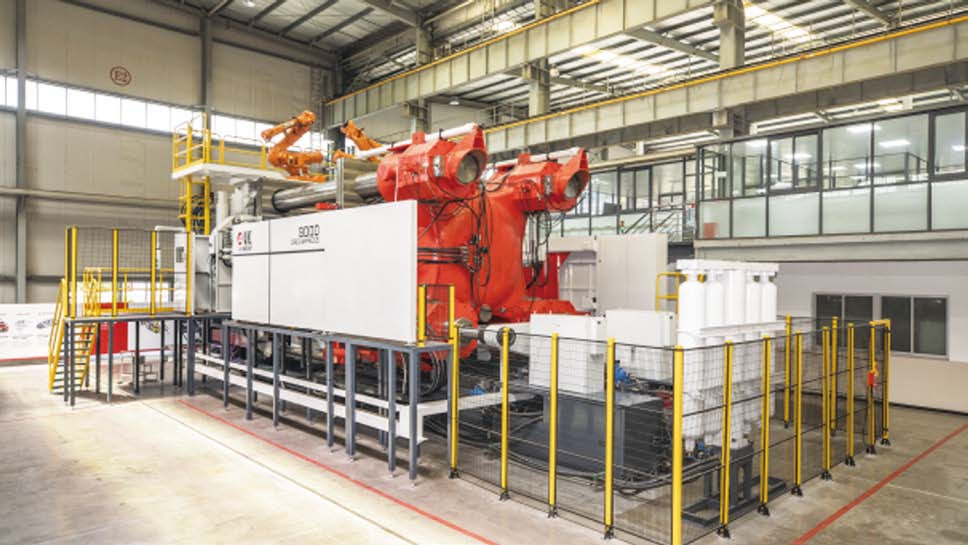 ▲ 圖7 封閉式零排放清洗水循環(huán)系統(tǒng) 嘉瑞集團(tuán)的創(chuàng)新成果涵蓋了材料、工藝、技術(shù)、管理和裝備。在鎂合金壓鑄上,從產(chǎn)品、工藝到設(shè)備創(chuàng)造多項“第一”,實現(xiàn)“壓鑄廢料→回收合金→壓鑄原料”資源的循環(huán)利用模式。2007年,嘉瑞集團(tuán)推出我國第一臺鑄鍛雙控成型機(jī),為汽車、摩托車等零部件制造提供了節(jié)能、降耗、高效的制造技術(shù)及裝備,該項目榮獲2007年國家機(jī)械工業(yè)科技進(jìn)步二等獎。從2007年開始,嘉瑞集團(tuán)致力于稀土鎂合金新材料的研發(fā),先后與重慶大學(xué)和中國科學(xué)院開展合作,在鎂合金的回收利用及添加稀土元素對鎂合金進(jìn)行改性優(yōu)化方面取得多項成果。至今,嘉瑞已成功開發(fā)高流動稀土鎂合金、高導(dǎo)熱稀土鎂合金等新材料,其優(yōu)異性能可為3C產(chǎn)品、新能源汽車中控散熱部件解決流動性差、散熱難等應(yīng)用瓶頸。2018年~2021年期間,嘉瑞集團(tuán)推出 4000噸及5000噸大型鎂鋁合金鑄鍛雙控壓鑄設(shè)備,為新能源汽車及建筑等行業(yè)提供大型鑄件壓鑄一體化生產(chǎn)服務(wù),見圖8、圖9、圖10。