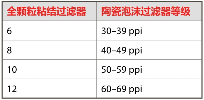 優(yōu)點 下表是全顆粒粘結(jié)過濾器與對應(yīng)的泡沫陶瓷過濾器(CFF)的等級對照