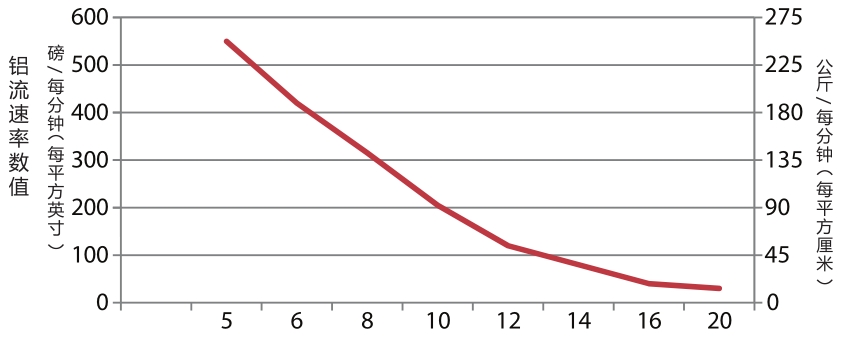 下圖顯示了全顆粒粘結(jié)過濾器尺寸對金屬流速的影響。以下結(jié)果為適當(dāng)預(yù)清潔金屬的一般結(jié)果。 顆粒尺寸與鋁液流速的變量關(guān)系