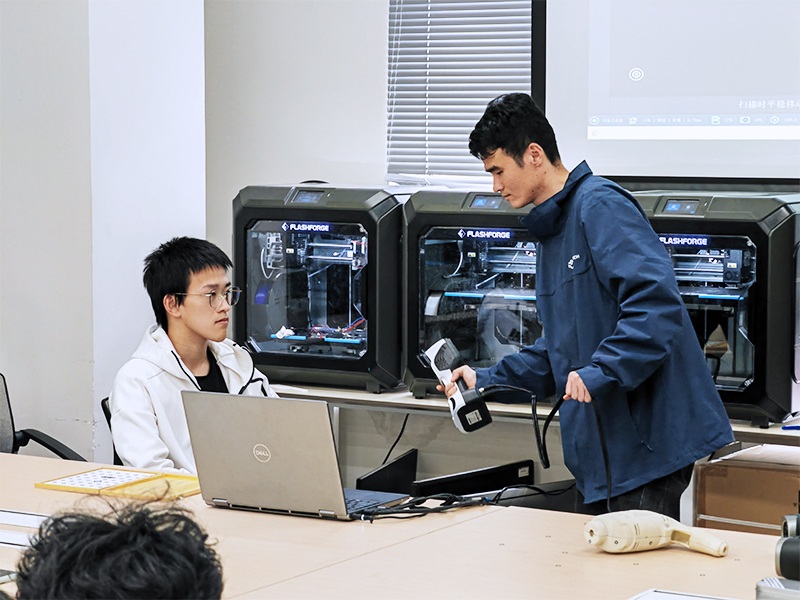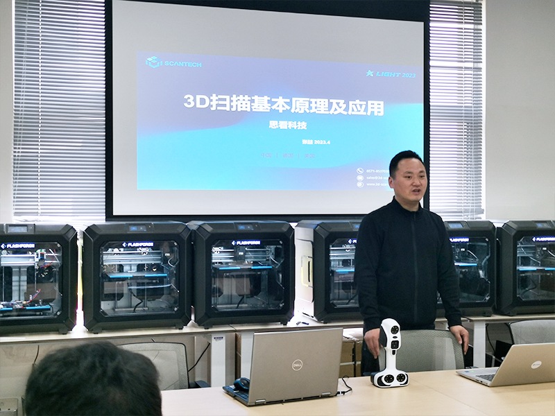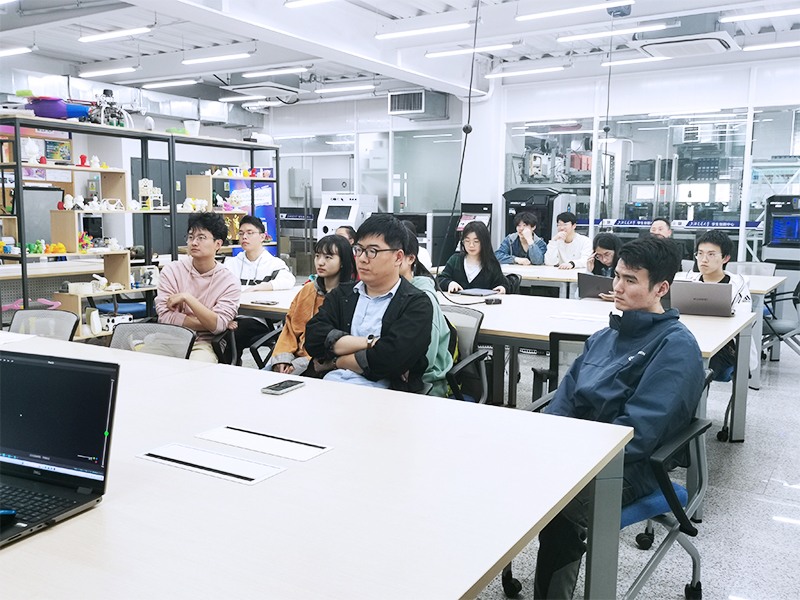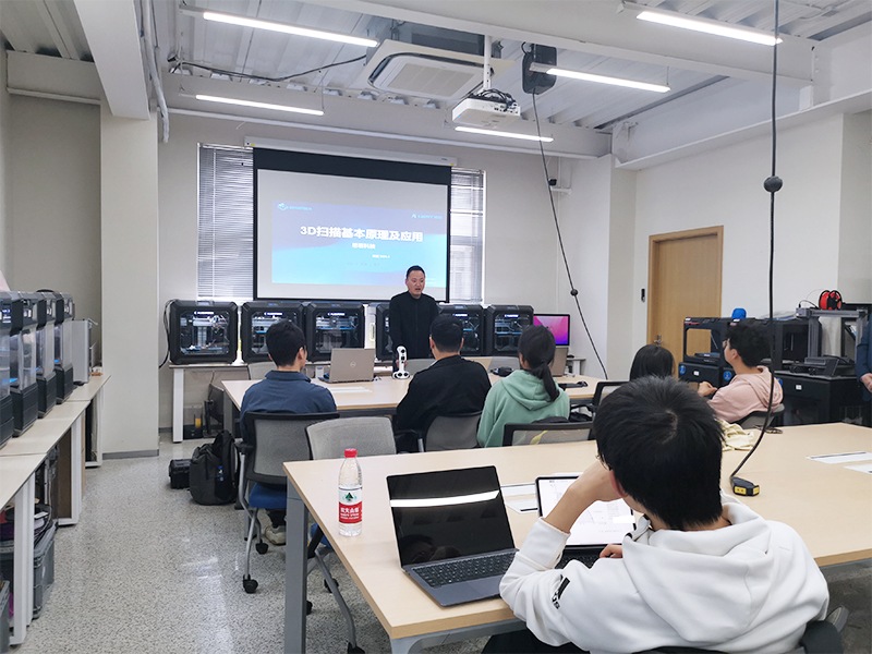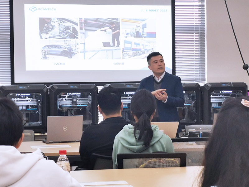 思看科技資深技術專家、上海交通大學優秀校友張喆專題為學生細致地講解了三維掃描基本原理及應用、3D掃描軟件的基本操作、3D掃描產品在各行業的典型應用案例等,帶領學生們全面認知3D掃描技術的發展現狀和未來趨勢。分享結束后,同學們就各自感興趣的技術問題和困惑進行了深入的探討。